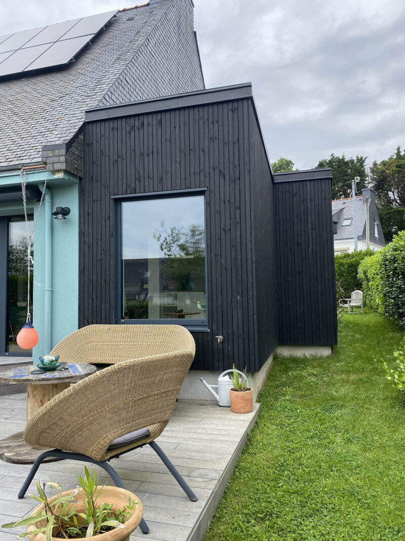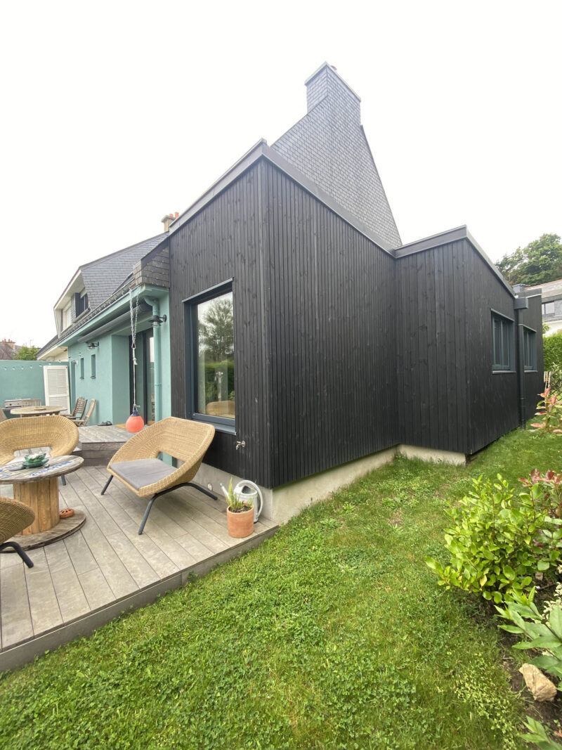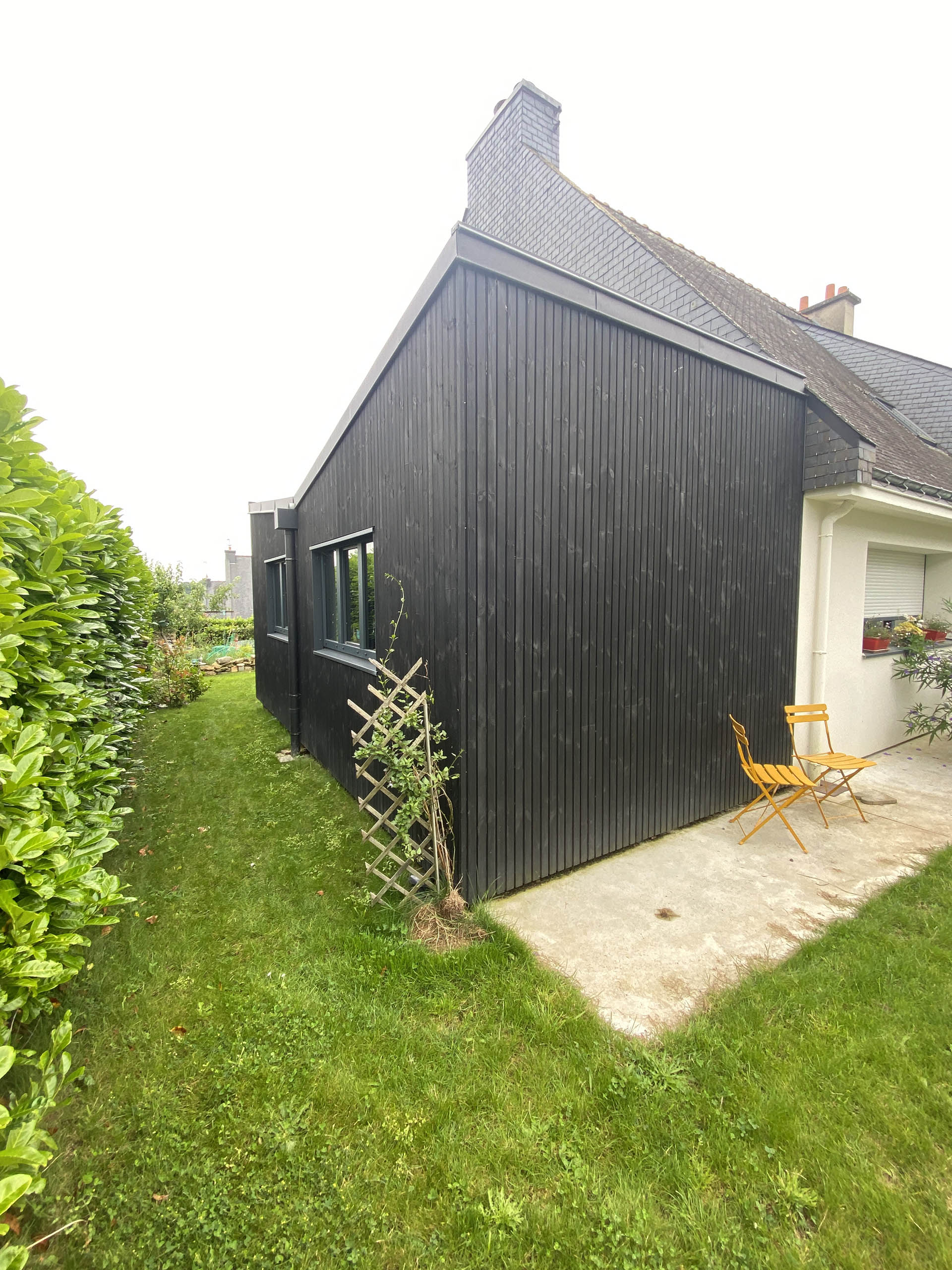 Le revêtement extérieur a été réalisé en bardage pin thermo-saturé noir de chez SIVALBP, offrant un rendu contemporain, chaleureux et durable.