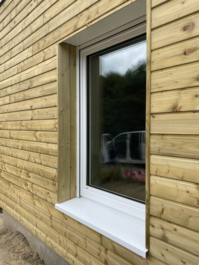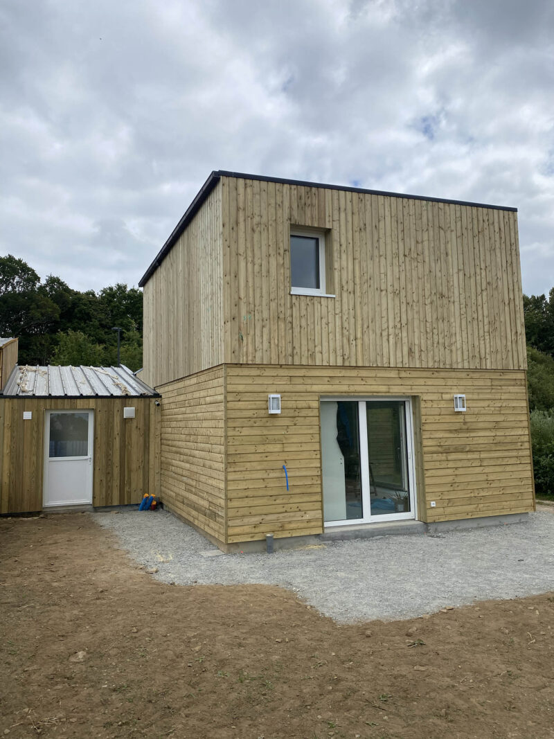 Cette maison à ossature bois s’inscrit dans une démarche de haute performance énergétique, conforme aux exigences de la construction passive. Elle est entièrement habillée d’un bardage en pin traité autoclave, garantissant une durabilité optimale face aux intempéries tout en conservant une esthétique sobre et naturelle.