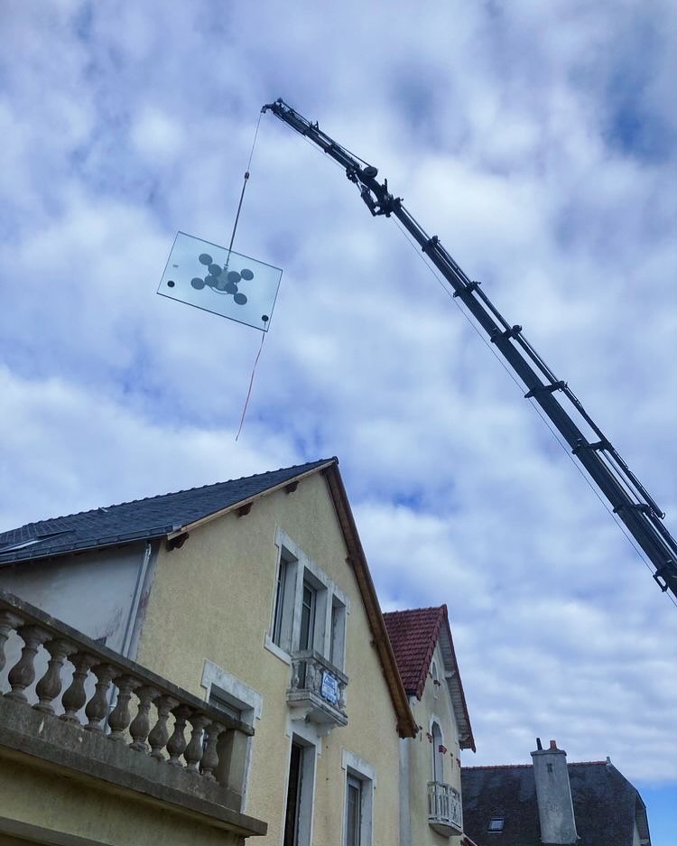 Parmi les points techniques majeurs, la mise en place d’un levant-coulissant avec vitrage de 360 kg a nécessité une opération spécifique : le grutage du châssis et du vitrage par-dessus la maison afin de permettre son acheminement et son installation en toute sécurité.