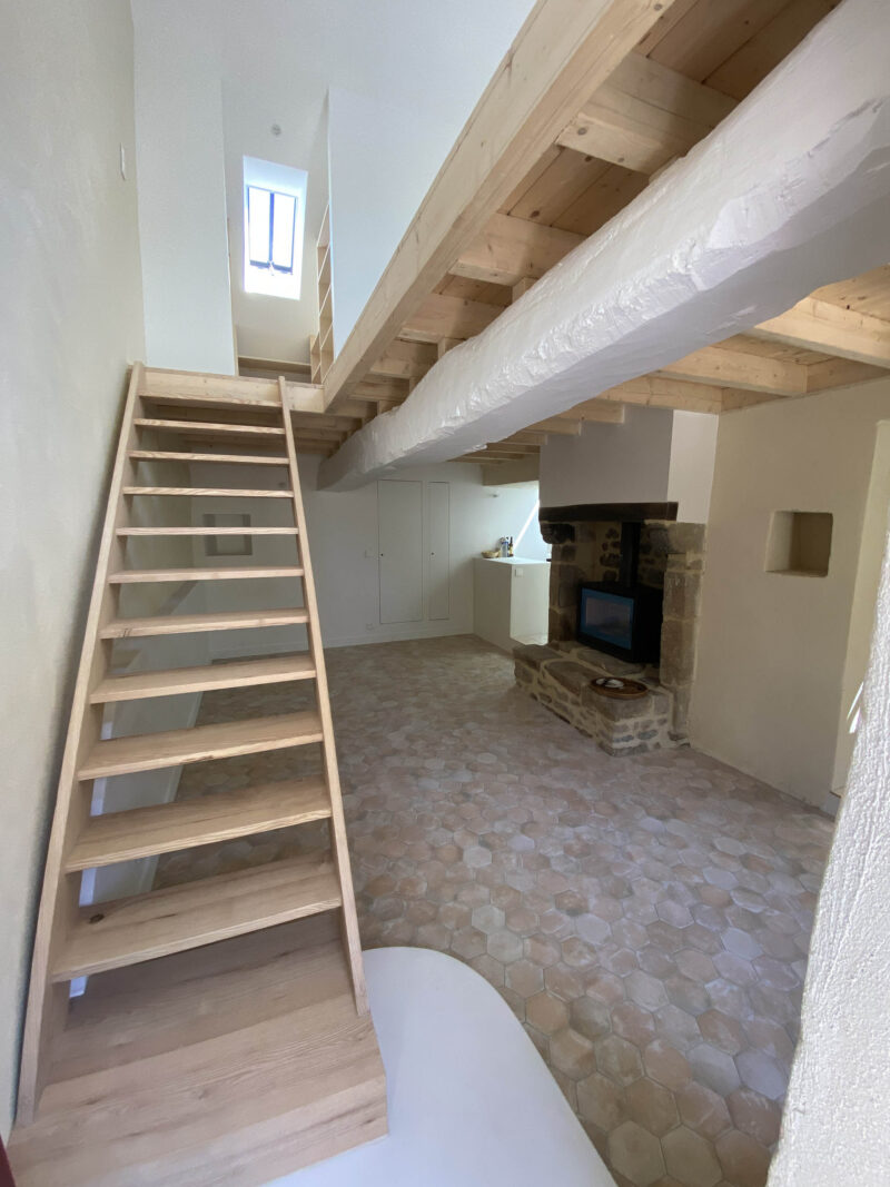 Dans ce projet de rénovation, nous avons transformé une petite maison en un espace à la fois chaleureux et performant sur le plan énergétique. L’ancien plancher, très dégradé, a été remplacé par un magnifique plancher en bois apparent, apportant chaleur et authenticité, tout en créant une atmosphère accueillante et naturelle.